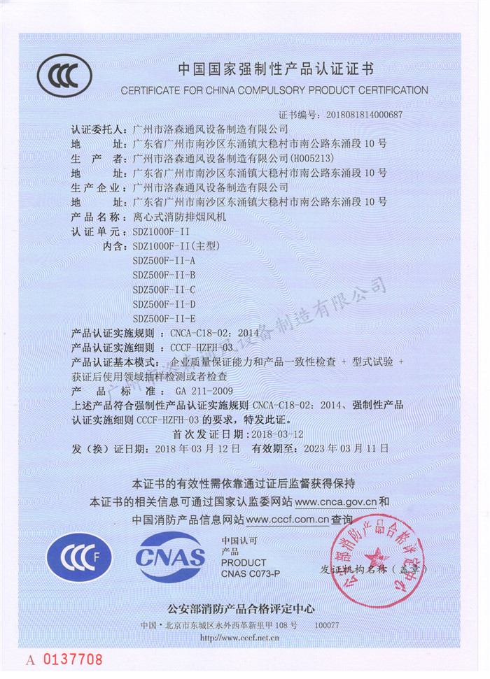• CCCF證書-洛森風機180314離心式消防排煙風機SDZ1000F-II(SDZ1000F-II~SDZ500F-II-E)