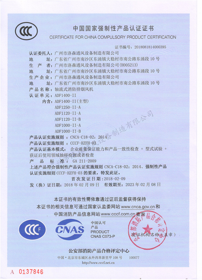 • CCCF證書-洛森風機180314軸流式消防排煙風機ADF1400-II(ADF1000-II-C~ADF1000-II-D)附件